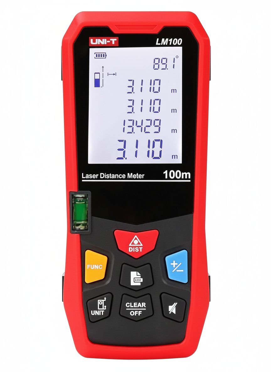 صُمم جهاز قياس المسافات بالليزر UNI-T LM100A لإجراء قياسات سريعة ودقيقة واحترافية. يقيس الجهاز مسافات تصل إلى 100 متر بدقة ±2 مم ودقة فائقة تبلغ 1 مم. تتيح لك الوظائف المدمجة حساب المساحة والحجم ومعادلة فيثاغورس فورًا، مما يوفر عليك عناء الحسابات اليدوية. مع ذاكرة تخزين تتسع لـ 99 مجموعة، يمكنك بسهولة استرجاع النتائج السابقة. يساعد وضعا القياس المستمر والحد الأدنى والحد الأقصى على تتبع تغير المسافات بشكل فوري. شاشة LCD بإضاءة خلفية وتصميم مريح يجعلانه سهل الاستخدام في المنزل أو في الموقع أو في الميدان.