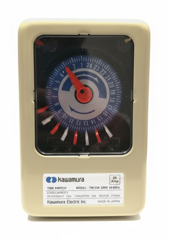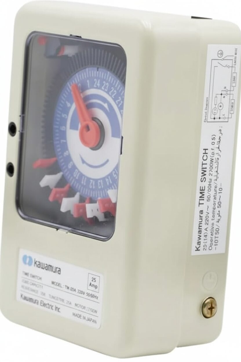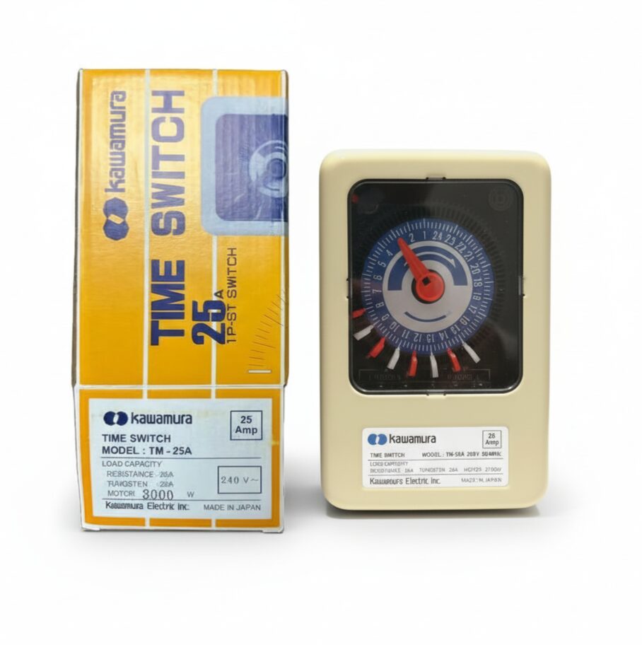 Take control of your appliances with the Kawamura 25A Timer Switch, a trusted and heavy-duty time switch made in Japan. Designed for high-power devices, this timer switch allows you to set automatic ON/OFF schedules for your equipment, making your daily routine more convenient and energy-efficient. With its 25A capacity and up to 3000W motor load support, it’s ideal for water pumps, motors, air conditioners, heaters, and lighting systems. The 24-hour timer dial makes it easy to program your appliances to run exactly when you need them. Built by Kawamura Electric Inc., Japan, this timer switch is known for quality, durability, and reliable performance. Whether you’re using it at home, on a farm, or in a business, it helps save energy and keeps your appliances running safely